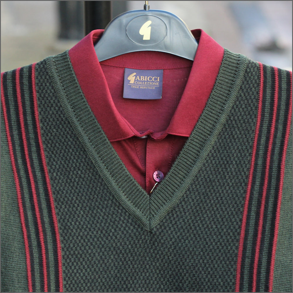 Stylish Ivy Patterned V Neck is a great addition to anyone's wardrobe and is one of the many choices of quality knitwear available in store and online. This Quality Neck V comes with a nice soft toning and can be worn with  various T Shirts. We would be happy to suggest a few options for you from our wide selection of Gabicci Tee Shirts. This year we have a wider than ever selection of quality V Necks. Made from 50% Wool and 50% Acrylic giving a hard wearing, machine washable, durable garment.