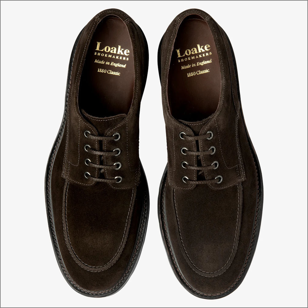 The Loake Mowbury is a pair of premium men’s shoes, crafted from soft dark brown suede leather in a timeless plain-tie design. Built on the Castle last, they offer a distinctive shape with a comfortable F fitting, making them versatile for both smart and casual wear. Featuring traditional Goodyear welted rubber soles, Mowbury provides durability, reliable grip, and long-lasting comfort, reflecting Loake’s commitment to quality. Designed and engineered in Kettering, Northamptonshire, and handmade in Loake's high-grade factory in England, these men’s shoes embody British craftsmanship and heritage. A refined and practical choice for the modern gentleman.