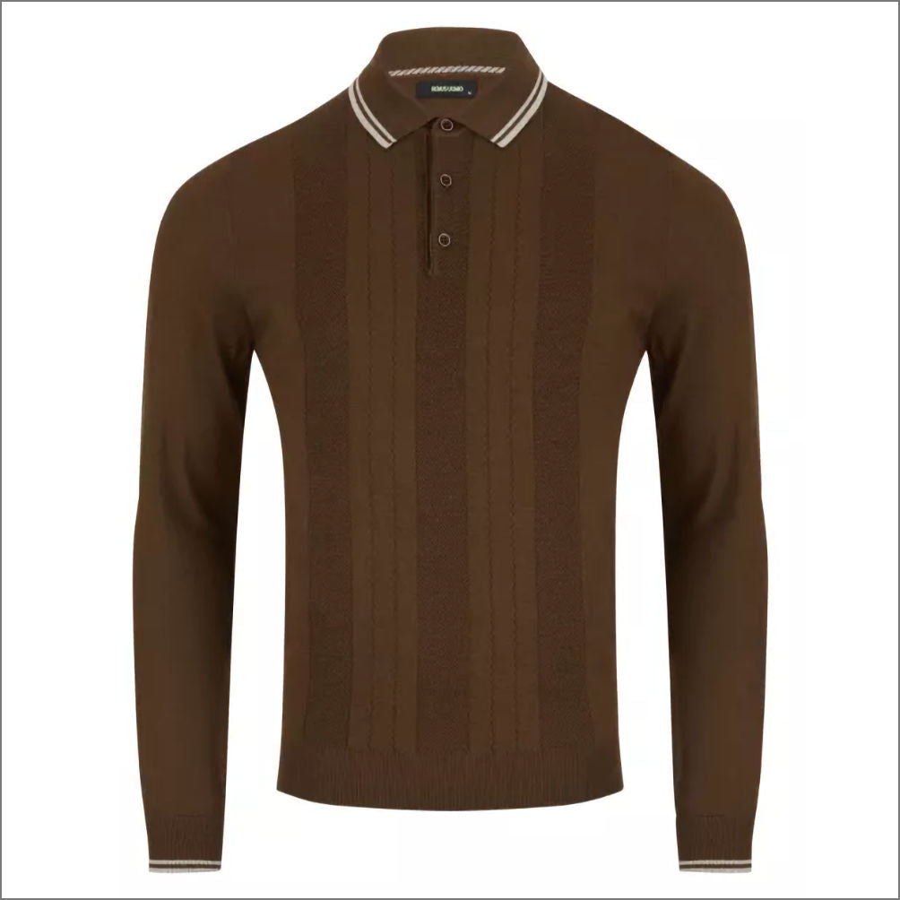 /Camel slim fit fine gauge merino wool-blend long-sleeved knitted polo with structured honeycomb knit front panel, contrast tipping detail on the collar and cuff, 3 button closing and ribbed cuff and hem.