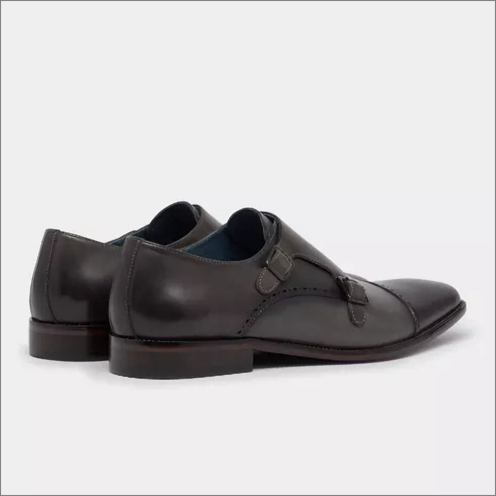 Charcoal leather monk strap brogue. Punched detail on toe and vamp. Two buckle with tonal elastic fastening with a leather sock and lining.