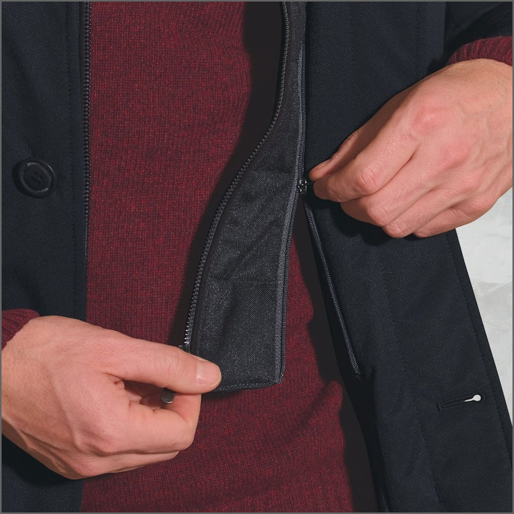 Coat: 155g. Single breasted, three button closure. Zip closure. Zip out mock gilet. Two exterior pockets. Fully lined. Two interior pockets. Centre vent with snap closing. Notch lapel with tab fastener. Machine washable.