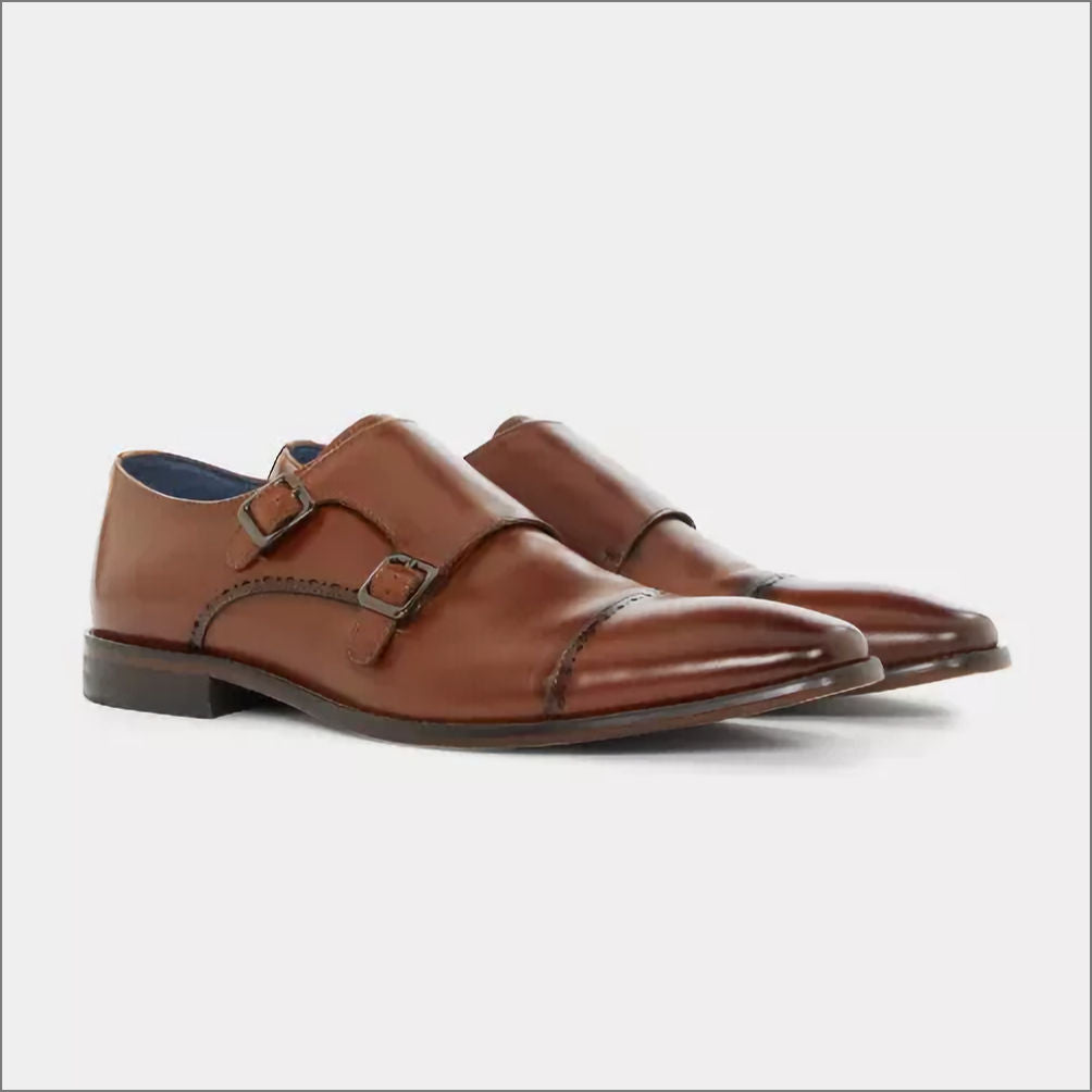 Tan leather monk strap brogue. Punched detail on toe and vamp. Two buckle with tonal elastic fastening with a leather sock and lining.